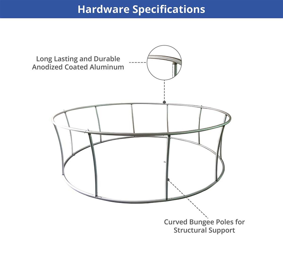 Sky-tube Circle Hanging Banners feature durable polyester fabric with a graphic weight of 230 GSM. The hardware is made of anodized-coated aluminum and includes bungee poles, curved poles, and inbuilt push-lock pins, with a pole diameter of 32 mm and thickness of 1.4 mm.